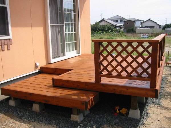 最初のDIYで慎重にやったせいか、思ったより時間がかりました。水平レベルだしやデッキ面の節の多さが結構目立ったので再塗装をしたり、デッキ下に草が生えにくいよう、シートを敷きその上に砕石をしいたりと・・・また、実際においた感じでレイアウトを変更したので、その加工もありました。マニュアル記載のように、下穴を怠ったので、手すりの笠木に少し割れができてしまいましたが、できばえとしては、満足です。