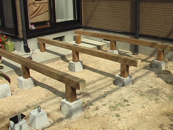 注文はweb(2800×3045)です。追加工してデッキと階段を製作しました。今回ウッドデッキとテラスを同時に取付ける事になり、そのテラスをサイズ変更した為、ウッドデッキの大きさや加工が変更になりました。その都度武田様には丁寧かつ迅速な図面を送って頂き有難うございました。お洒落な庭にしたいという希望からウッドデッキが欲しいと思い、ネットサーフィンをしていたら 中川木材さんのホームページを見つけました。高品質&塗装済&防腐剤済でこの値段にひかれ購入を決めました。みなさんが感想で思われている通り、基礎の水平だしに時間と手間がかかりました。今回園芸ポールと水糸で水平をとりましたが、丁寧に作業した為、ほぼ水平が取れました。水平は、基準となる基礎石からの水平をきちんと取ったので、その後の作業がスムーズに運びました。ただ多少のずれがあっても、束柱と基礎石の間にゴムを敷いたり、大引きを水平の状態(束柱と大引きの間に多少の隙間があっても)で固定すれば問題無いと思います。基礎さえ出来てしまえば、後の作業はスムーズに運びました。ビスの下穴は時間がかかりますが、下穴を開けた方が仕上がりが良く、ビス止めの作業がやり易かったです。ビスの締めすぎは注意しないと、木材の表面が割れそうになりました。デッキの作業途中で、テラスの工事の方が見えた際にデッキを見て、「大引きの反りが無いし、床板もやわらかい良い木材を使ってるね。」と言われました。友達やご近所さんからの評判も大変良く大満足です。ウッドデッキでのお茶&お食事が楽しいです*(^^)*/